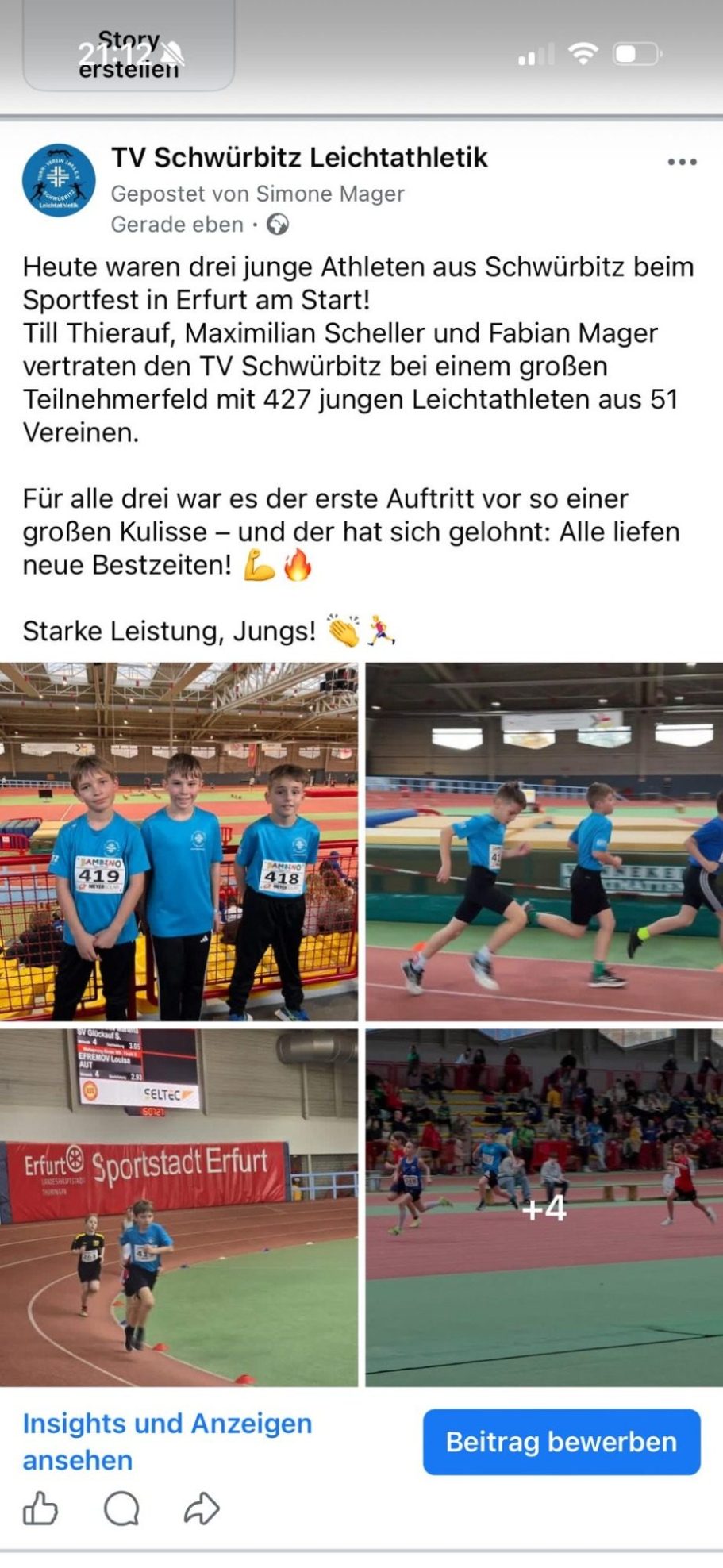 Für Schwürbitz am Start waren Till Thierauf in der Klasse M10, sowie Fabian Mager und Maximilian Scheller in der Klasse M11. Alle 3 Athleten liefen im 50m Sprint und über 800m Bestzeiten. Insgesamt waren 427 junge Leichtathleten/innen aus 51 Vereinen in der Halle in der schon Europameisterschaften ausgetragen wurden am Start. Für die jungen Schwürbitzer war es das erste Mal, dass sie vor so einer großen Kulisse starten durften.