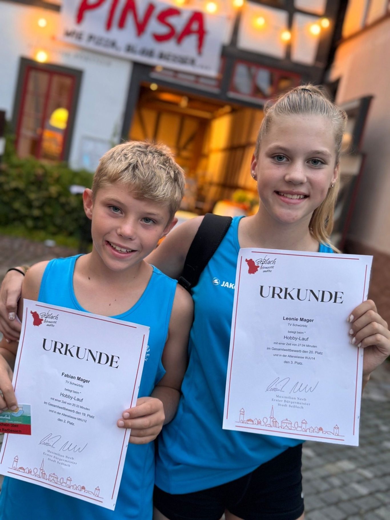 Beim 15. Seßlacher Stadtlauf gingen Fabian Mager und Leonie beim Hobbylauf über 4km an den Start. Bei 35 Grad und einem kurzen Regenschauer freuten sich Beide über ihren Erfolg auf dem Siegerpodest . Fabian kam auf den 2. Platz in der M11 Klasse und Leonie auf den 3. Platz in der W 13 Klasse. Glückwunsch zu diesem Erfolg auch für das Schwimmabzeichen in Gold.