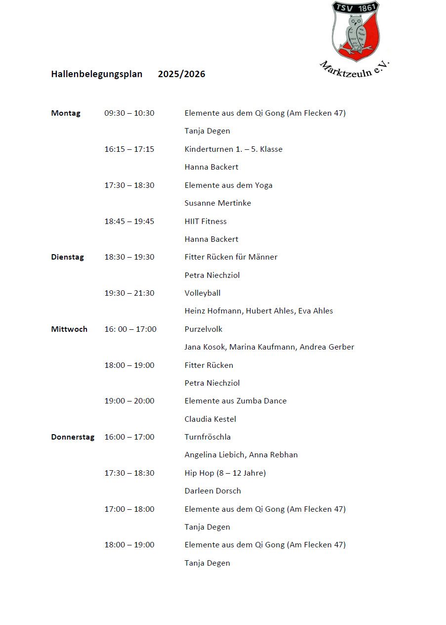 Die Gymnastik findet immer montags von 18:00 bis 19:00 Uhr im TV-Heim statt. Bei schönem Wetter wird im Freien geturnt.